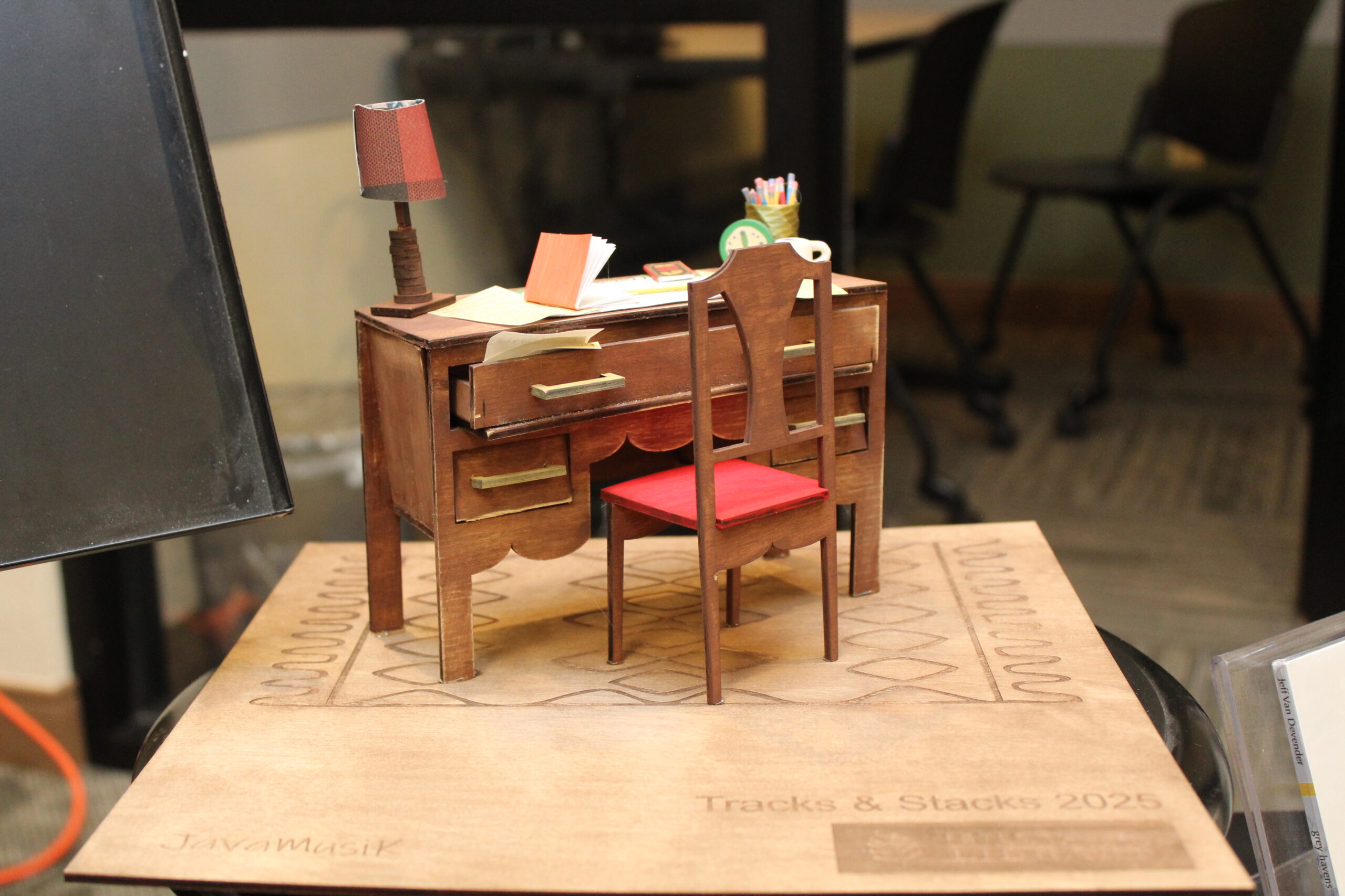 On top of all that, there was the matter of having space for each of the six bands or musicians to perform next to a desk! Shari took care of that, too, using the library’s makerspace to create adorable and incredibly detailed tiny desks for each band or musician to have in their video and take home with them as a memento.