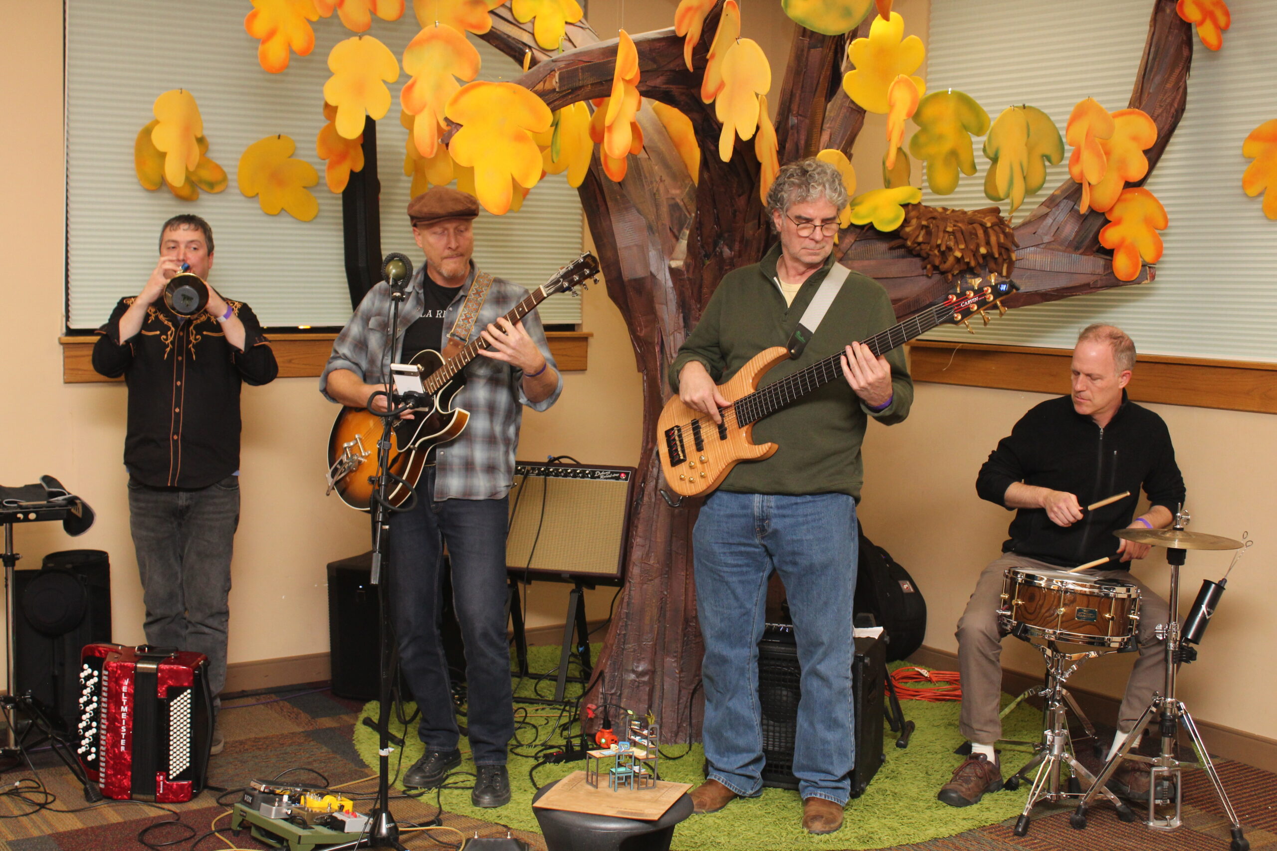 It was clear enthusiasm for the event was high when seventeen bands applied for the six spots available. Three judges (including Jason) used a rubric to select which bands or musicians would ultimately perform at the event, and preference was given to local bands. All different types of music made the cut, including a pianist, a pump organ player, and a jazz and funk group to name a few. Information about each of the performing artists is available on Estes Valley Library’s Tracks & Stacks webpage. When asked what he thought motivated the artists to participate, Jason explained that the Tiny Desk submission video was likely a driving factor for some, but the unique venue and getting “to make noise in the library” was also a draw. Shari shared a similar sentiment. Saying, with a smile on her face, “It feels a little bit rebellious to be playing loud music in the library.”